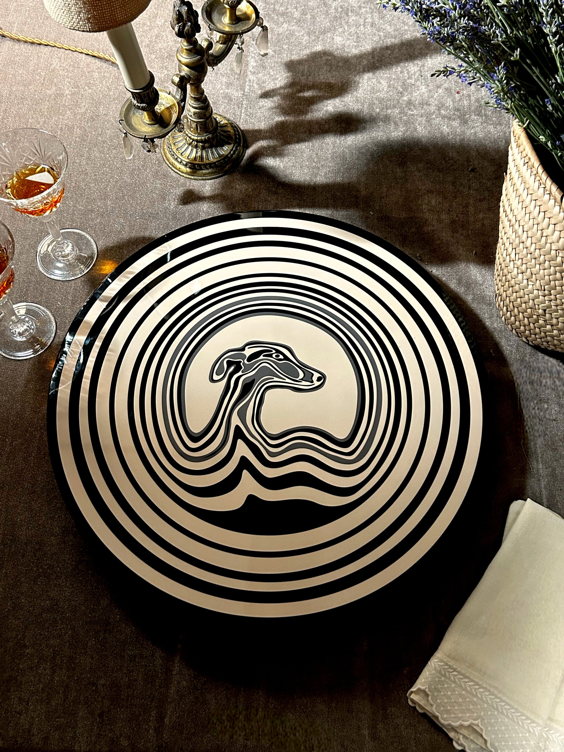 Plato giratorio blanco marfil y negro con perfil en gris marengo con diseño de animales, con amplia superficie de apoyo de ø45, permite una rotación fácil y suave en ambos sentidos.